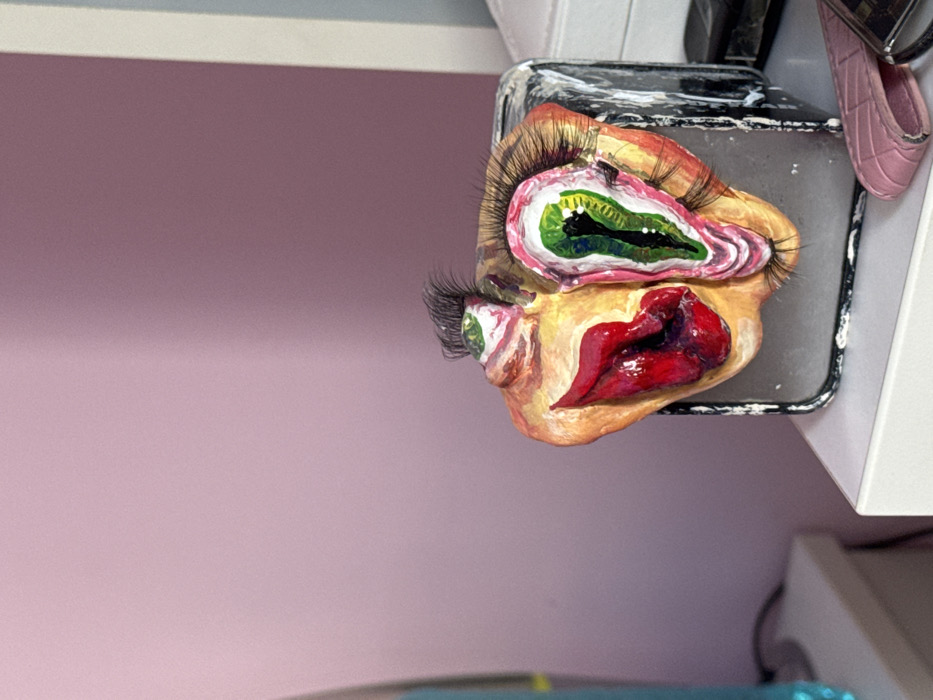 The scene, located indoors in Pleven, Bulgaria, features a close-up of a surrealist sculpture. The artwork, composed of textured materials resembling flesh, presents distorted human-like features: a prominent set of red, parted lips with a dark interior on the left, and an elongated eye structure with green, white, and black concentric patterns, surrounded by pink folds and long false eyelashes on the right. A smaller, round eye-like element with a green center and short dark bristles is positioned above the lips. The sculpture is affixed to or resting upon a dark, square-shaped base with partially reflective sides, exhibiting white residue along its perimeter. This base rests on a white, flat surface. A partially visible, light pink quilted object is situated on the same surface to the lower right of the base. The background comprises a wall displaying a gradient of light to medium pink-purple coloration. A blurred, vertical teal object is partially visible on a lower white surface in the far left background.