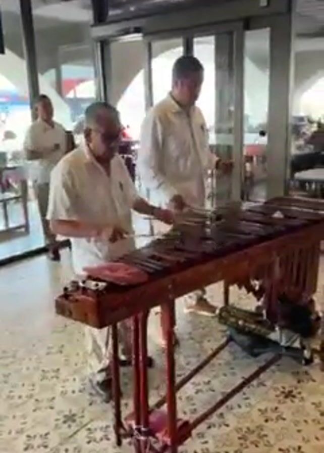 Two men play a large marimba inside a building with large windows. The men wear light-colored shirts and pants. The marimba is brown with red legs and sits on a patterned tile floor. The building appears to be a restaurant or dining area, with tables and people visible through the windows and in the background. The men play the marimba simultaneously, each holding two mallets. A sign with "DIA" visible is in the upper left corner.