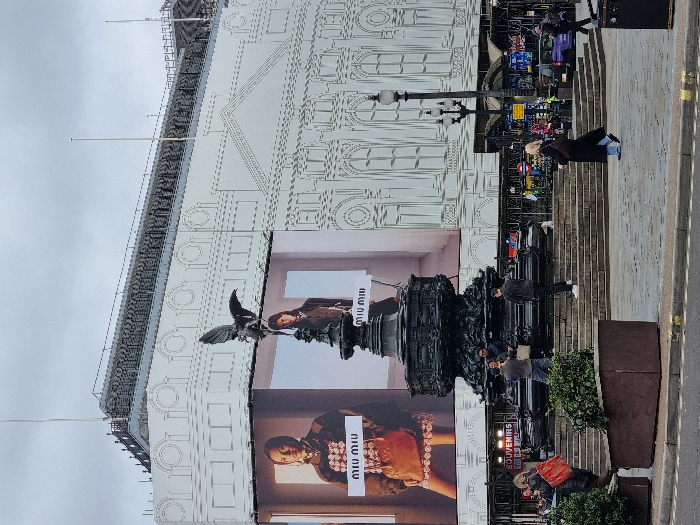 This image depicts Piccadilly Circus in London, United Kingdom, on an overcast day. The central focus is the Shaftesbury Memorial Fountain, commonly known as the Eros statue, a dark bronze monument featuring an ornate, multi-tiered base and a winged figure (Anteros/Eros) atop a central column. This monument rests on a wide, tiered stone plinth with steps. Behind the fountain, a large building is extensively covered in white architectural hoardings that simulate classical building elements such as windows and columns. Integrated into these hoardings are two large digital advertising screens, both displaying "MIU MIU" fashion advertisements. The left screen features a woman in a patterned top and skirt holding a brown handbag, while the right screen shows a woman in a dark vest. Scaffolding structures are visible above the hoardings along the building's roofline. Below the left advertising screen, a shop sign reading "SOUVENIRS" is partially visible. The foreground consists of a grey paved pedestrian area, separated from a darker roadway by a grey curb with a yellow line. Two dark brown rectangular planters containing green foliage are positioned in the left foreground. Approximately eight discernible individuals are present. Near the fountain's base, three men are visible: one in a grey top holds a phone, apparently taking a photograph; another in a dark jacket and jeans stands to his right; and a third man in a dark jacket is seated on a lower ledge of the fountain's plinth. To the far left, a person in a dark coat carries a red tote bag while walking leftward. In the right foreground, a person with blonde hair, wearing a long black coat and blue jeans, walks right-to-left carrying a dark shoulder bag. Additional pedestrians and vehicles, including a purple van, are visible in the background street. Two black multi-armed streetlights are present on the right side of the frame.