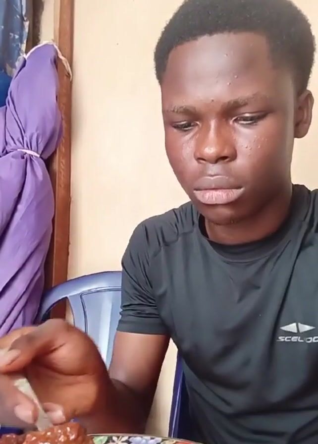 A young man with short dark hair, wearing a black shirt, is seated on a blue plastic chair and eating from a plate of rice and a dark, saucy dish with a fork