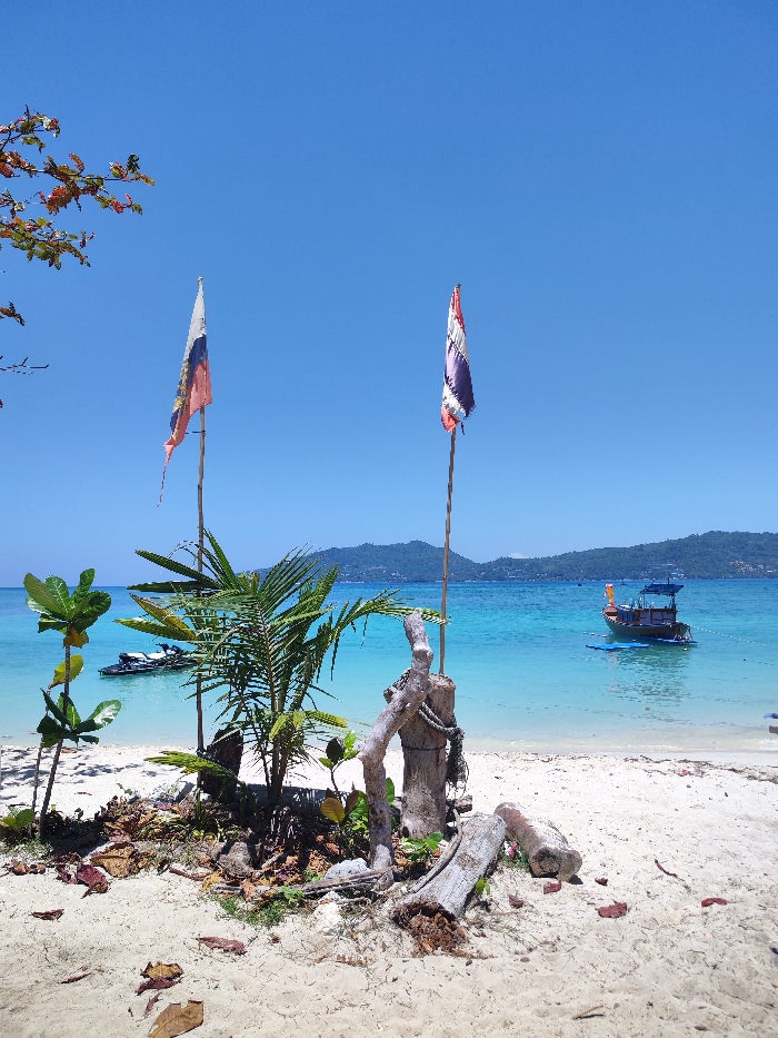 The image depicts a sandy beach scene in Patong, Thailand, under a clear, bright blue sky. In the foreground, a light-colored sandy beach occupies the lower third of the frame, with scattered dry brown and reddish leaves. A cluster of green foliage, including small palm fronds and broader-leafed plants, grows from the sand near the center. To the right of this foliage, a weathered wooden post stands upright, adorned with coiled rope. Several pieces of broken and weathered driftwood or logs lie horizontally on the sand around the post. Two flags are displayed on simple wooden poles, positioned behind the foreground vegetation. The left flag features horizontal stripes of white, blue, and orange/red. The right flag displays vertical stripes of red, white, and dark blue or purple. Both flags appear somewhat frayed at their lower edges and tops. The midground features calm, clear turquoise ocean water, transitioning to a deeper blue further from the shore. Two white personal watercraft (jet skis) are visible floating near the left edge in the shallower water. To the right, a traditional longtail boat with a blue canopy and yellow/orange flotation devices is anchored further out in the bay. In the background, a lush green, hilly landmass or island stretches across the horizon under the clear sky. No individuals are visible in the scene. The overall lighting suggests direct, bright sunlight.