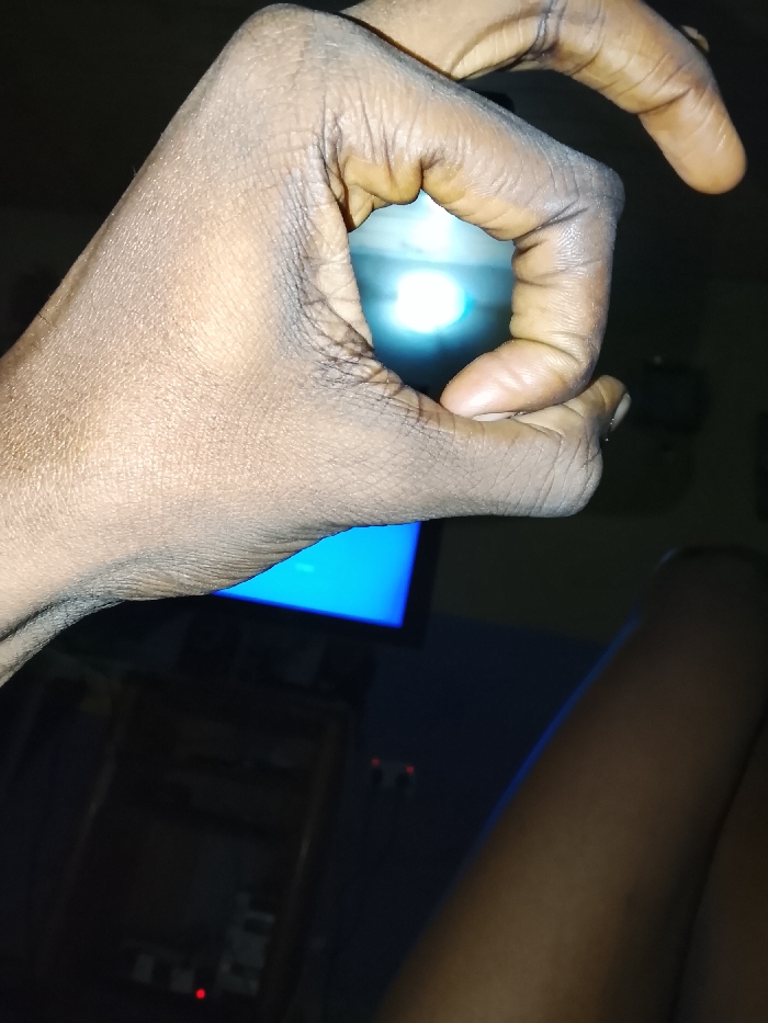 This image, taken in a city of Unknown, Unknown, depicts an interior, dimly lit environment. A human right hand, exhibiting dark skin pigmentation and visible dermal creases, occupies the left and central foreground. The fingers and thumb are curled inward, forming an irregular, roughly 'C'-shaped aperture. Through this aperture, a bright, diffuse bluish-white light source is visible. In the background, to the right of the hand, a flat-screen television displays a solid blue output. A dark-toned furniture piece, likely a media console, is positioned beneath the television. Two small red indicator lights are visible on a surface to the right of the television. The upper section of a bare human leg, also exhibiting dark skin pigmentation, is visible in the lower right quadrant of the frame, angled diagonally upwards.
