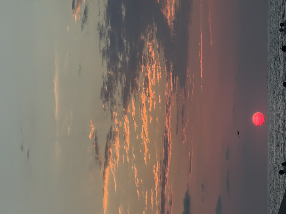 A serene sunset view over water, with an exaggeratedly red sun reflecting on the gentle waves. Silhouetted figures are visible on the shoreline. The sky is a blend of grey, orange, and pink, adorned with elongated clouds that appear streaked with gold. The contrast of the dark clouds against the fiery sunset creates a striking and peaceful visual.