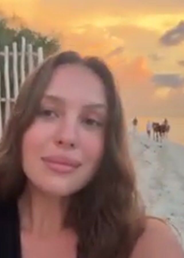 A woman with long brown hair, wearing a black sleeveless top, is the primary subject of a selfie-style video taken on a beach