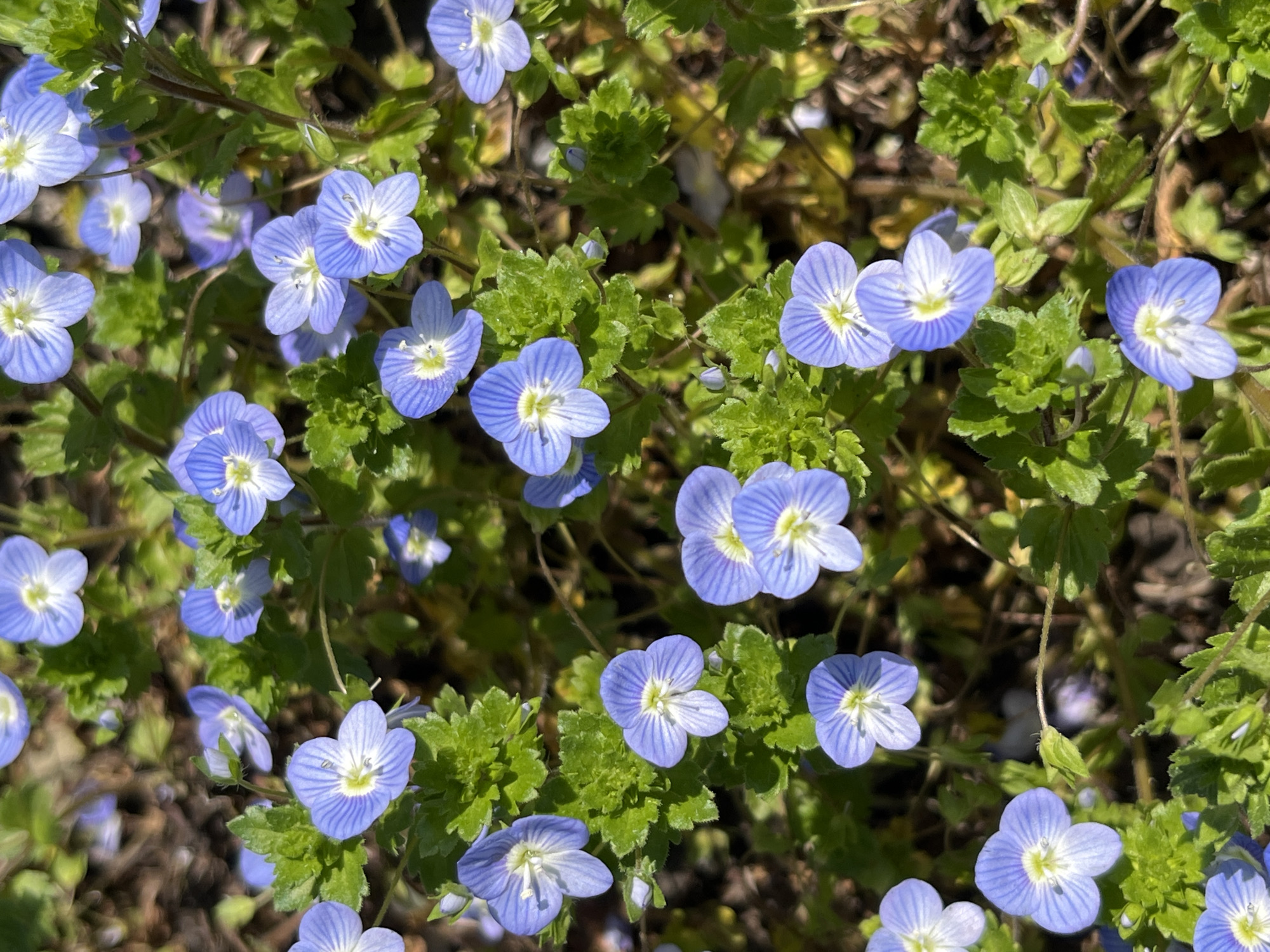 The image displays a detailed, close-up view of a dense patch of small, light blue flowers with associated green foliage, located in Pchelnik, Bulgaria. The flowers, consistent with a Veronica (speedwell) species, each feature four rounded petals with subtle darker blue venation emanating from a central white area containing minute yellow stamens. Their approximate diameter is 1-2 centimeters. Numerous small, deeply serrated green leaves form the ground cover, interspersed with several unopened flower buds. The background is out of focus, showing dark earth and blurred vegetation. The scene is illuminated by natural daylight, which highlights the plant structures and casts minor shadows. No people, animals, or man-made objects are present. No actions or interactions are depicted.