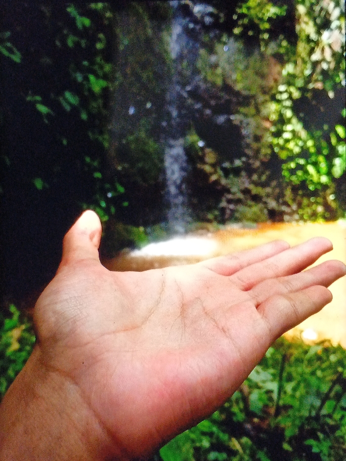 - "A human hand, palm open and facing the viewer, is superimposed over a blurry background of a waterfall and lush greenery" by FM-2fpsE3, licensed under CC BY 4.0