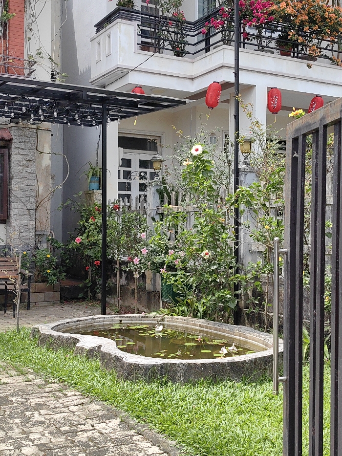 The scene depicts an outdoor garden area within Phú Xuân Ward, Vietnam. In the foreground, a heart-shaped pond with stone edging contains murky water, several lily pads, and three small, light-colored birds positioned on or immediately adjacent to its rim. The pond is surrounded by neatly trimmed green grass and a section of gray interlocking brick pathway on the left. To the immediate left, a wooden bench and table are visible on a paved surface, positioned against a building section featuring a stone-clad wall and a dark-framed window. A black metal pergola, fitted with string lights, extends across the mid-ground. Beyond the pond and pergola, a diverse garden contains numerous flowering plants, including white and pink hibiscus varieties, enclosed by a low white picket fence. In the background, a multi-story, light-colored building is present. Its ground floor exhibits a white paneled door, flanked by two stone pillars each topped with a yellow lamp. Several red traditional lanterns with intricate patterns hang from the building's facade, particularly beneath an upper-level balcony. This balcony, equipped with black metal railings, showcases multiple potted plants with vibrant pink and orange flowers. A black metal gate with vertical bars and a silver handle is partially visible on the far right of the frame. No human subjects are present.