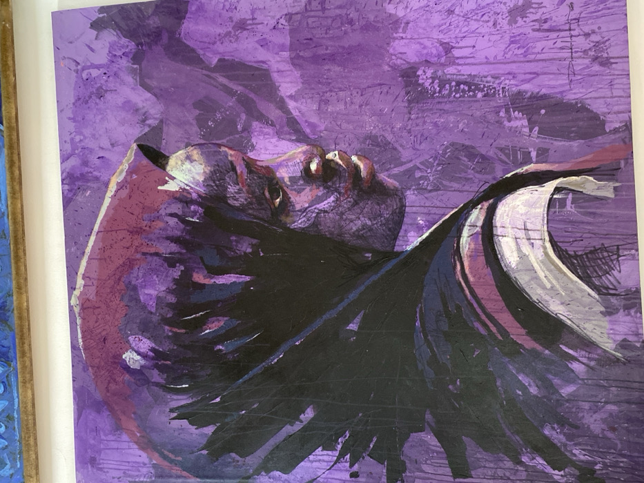 A vertical photograph captures a rectangular acrylic painting displayed on a white wall in Ikate, Nigeria. The painting depicts a profile portrait of an individual, positioned facing right within the canvas. The figure's visible skin is rendered with pronounced brushstrokes in shades of purple, blue, and reddish-pink. A dark purple and black head covering drapes over the head and shoulders, with a portion of a white garment visible over the left shoulder. The background is an abstract composition of varied purple tones, characterized by textured paint application, drips, and splatters. A thin white border frames the lower and right edges of the canvas. Above this painting, a segment of another framed artwork, featuring blue hues within a gold-colored frame, is partially visible at the top of the image.
