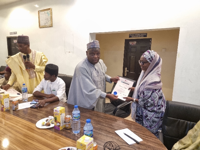 The scene takes place in a meeting room located at the coordinates 11.832, 13.143 in Maiduguri, Nigeria. A man wearing a light-colored robe and a cap is holding two microphones, standing to the left of a man wearing a grey robe and a cap. He is handing a certificate to a woman wearing a hijab who is seated in a black chair. The woman is smiling. There are several items on the table, including juice boxes, water bottles, and a white plate of treats. There are two other people seated in the background, partially obscured by the table. One person is seated to the left of the man holding the microphones, and one person is partially visible seated on the far right side of the room. The room is clean and well-lit. There is a door in the background, labeled "PRINCIPAL INTERNAL AUDITOR AFFAIRS OFFICER."