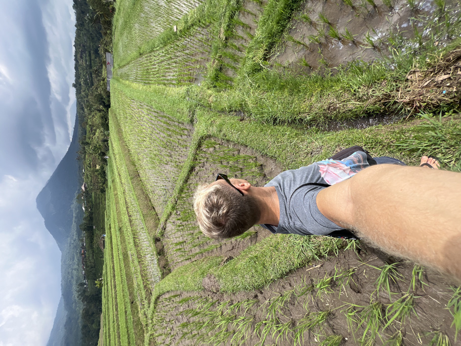 A man in sunglasses stands within a flooded rice paddy. Verdant rice terraces line up to a mountain in the distance, beneath a cloudy sky. The man wears a gray t-shirt and sandals, holding the camera for a selfie. Lush greenery carpets the landscape around the rice fields.