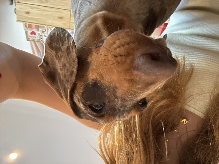 A dachshund-type dog looks down at the camera. The dog is brown with darker brown spots, particularly around the eyes. The dog's ear is visible on the left, and a person with fair skin is partially seen on the left, near the dog’s ear. Blond hair and a gold necklace are visible on the right side. In the background is a wooden dresser.
