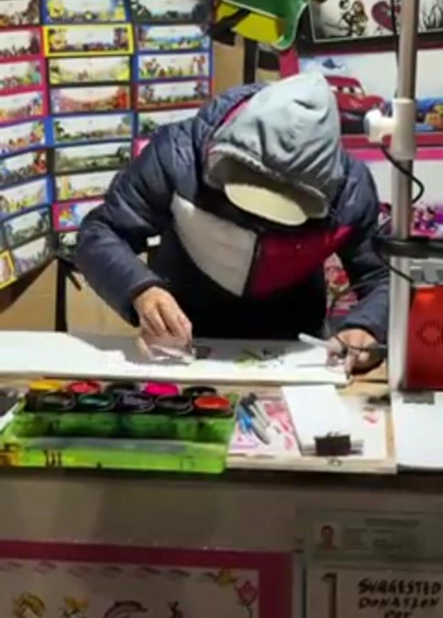 A person is painting on a piece of white paper using watercolors. They are wearing a hooded jacket and a baseball cap. A collection of brightly colored watercolor paints are visible, as well as markers. The person is working at a table, and behind them are several cartoon-themed framed artwork. A sign on the table asks for donations for a pot letter. The individual appears focused on their artwork, carefully selecting colors and applying them to the paper.