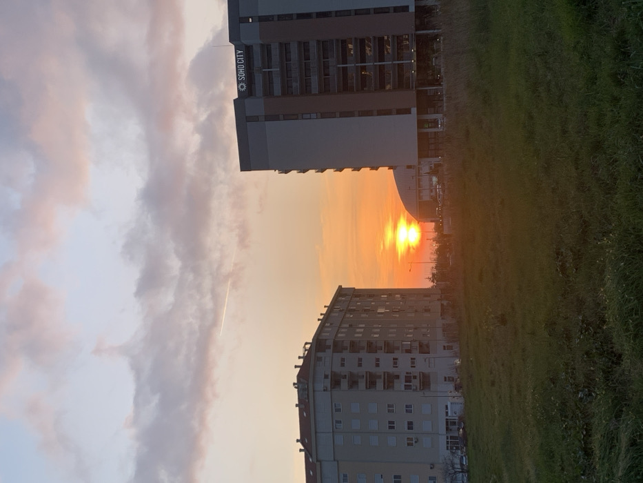 The image depicts a sunset scene in Bar, Montenegro, specifically featuring the Soho City complex. In the foreground, a large expanse of unkempt green grass fills the lower half of the frame. Two multi-story buildings dominate the midground. On the right, a modern, grey and brown high-rise building is visible, with "SOHO CITY" and a circular logo prominently displayed near its top. This building has multiple balconies and large windows, reflecting the sky and the sun's glow. To the left, a cream-colored residential building with a reddish-brown roof, also multi-storied and featuring numerous windows and balconies, stands partially obscured by the field. Between these two buildings, the setting sun, a brilliant orange-red orb, is visible just above the horizon, appearing slightly distorted or doubled due to atmospheric conditions. Hints of other, lower buildings or structures are visible in the distance, partially silhouetted by the sun. The sky transitions from a deep orange and yellow near the horizon to a lighter blue-grey and soft pink at the top, with scattered, elongated pinkish-grey clouds. A single, thin white contrail from an aircraft is visible high in the sky, stretching diagonally across the upper left quadrant. No discernible people or specific actions are visible.