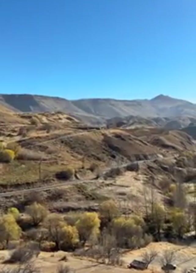 landscape featuring dry, rolling hills under a clear blue sky. The sun is shining brightly, and in the valley below, a winding river flows through trees that are tinged with autumn colors. A narrow road cuts through the scene, adding a human element to the otherwise natural setting. The overall impression is one of serene beauty and tranquility.