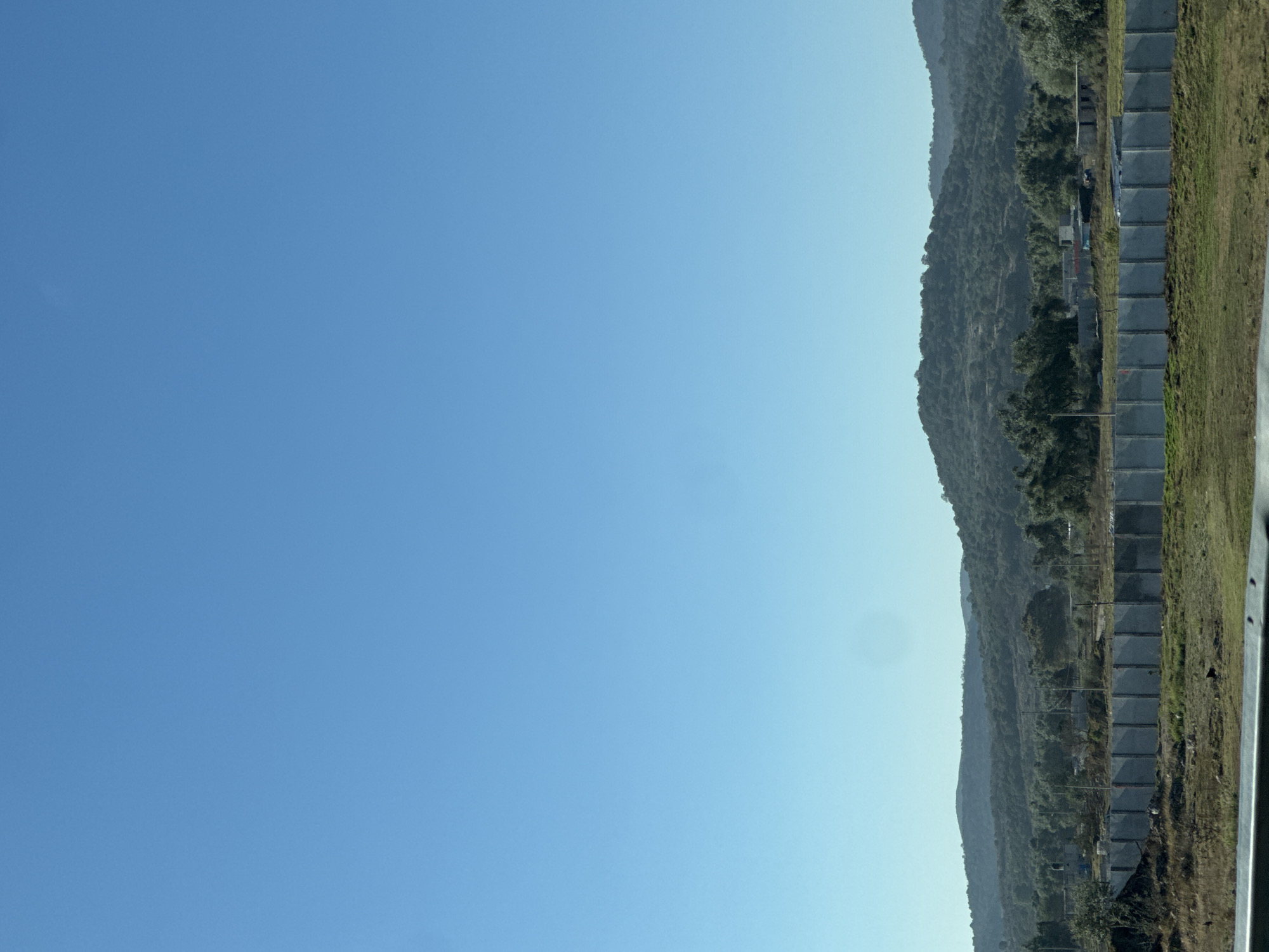The image displays an expansive, clear blue sky occupying approximately the upper two-thirds of the frame. The lower third features a landscape, observed from a low vantage point, possibly from within a vehicle, indicated by a metallic silver rail component visible at the bottom edge. In the midground, a uniform barrier composed of numerous rectangular, light-gray concrete panels runs horizontally across the scene. Each panel is vertically oriented and evenly spaced, forming a continuous line. Behind this concrete barrier, a landscape unfolds with scattered green trees and some rudimentary, low-rise structures with light-colored walls, indicative of ongoing construction or established simple buildings. Utility poles or similar vertical structures are visible amidst the trees and buildings. Further in the background, a series of rolling hills, densely covered with dark green vegetation, recede towards the horizon under the bright sky. The immediate foreground consists of a narrow strip of dry, patchy green and brown vegetation. No individuals, specific actions, or interactions are discernible within the scene. The overall environment suggests a rural-urban interface. This scene is located in the vicinity of Amozoc de Mota, Mexico.