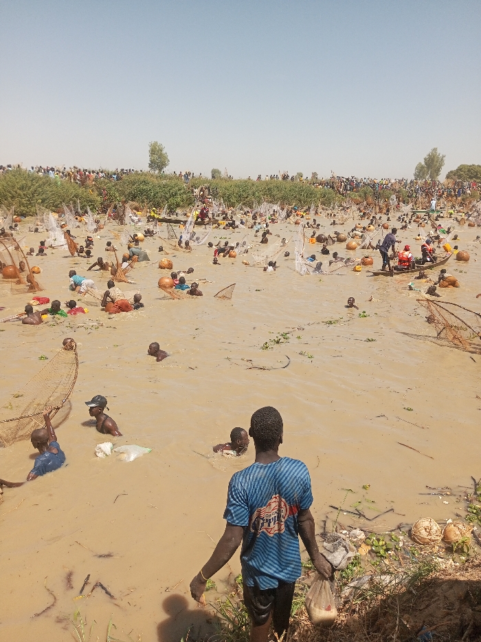 A wide-angle image depicts a large-scale communal fishing event in a muddy body of water, identified as occurring in Kokani North, Nigeria