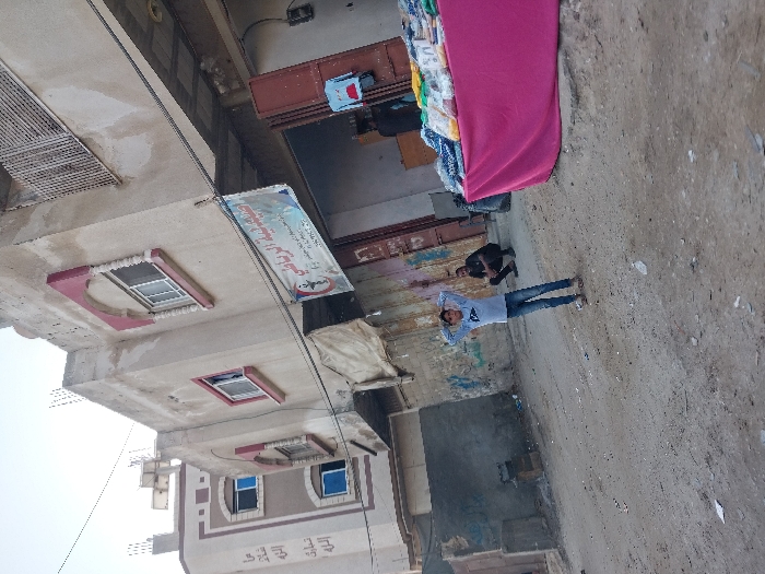 The image depicts a street scene in Deir el-Balah, Palestinian Territory, under clear daylight conditions. In the foreground, a young male stands centrally on a dirt and gravel street, facing the viewer with his hands behind his head. He wears a light blue long-sleeve shirt with a dark logo on the chest, blue jeans, and light-colored sandals. To the right of the young male, a makeshift vendor table covered with a pink cloth displays stacks of items, likely clothing, in clear plastic bags. Behind the young male, an adult male crouches on the ground, wearing dark clothing. Further back, a multi-story building constructed of light-colored plaster dominates the scene. This building features multiple arched windows with red frames and white sills on the upper floor, and rectangular windows with similar frames on the lower floor. A metal balcony with a decorative grate is visible on the upper right. A banner sign, partially obscured, hangs from the building, displaying Arabic text and a red crescent symbol; readable text includes "مركز علاج طبيعي وتاهيل رياضي" (Center for Physical Therapy and Sports Rehabilitation). Below the sign, a dark brown double-door entrance to a shop is visible, with articles of clothing hanging for display. A dark figure is partially visible inside the shop. To the left of the main building, another multi-story structure with a light-colored, patterned facade and blue-framed windows is partially visible. Exposed rebar protrudes from the top of this building. The ground in the foreground and midground consists of uneven dirt and scattered small debris. Graffiti is present on some of the wall surfaces. A black trash bag and a power meter box are also visible on the right side of the frame. The sky above is clear and light.
