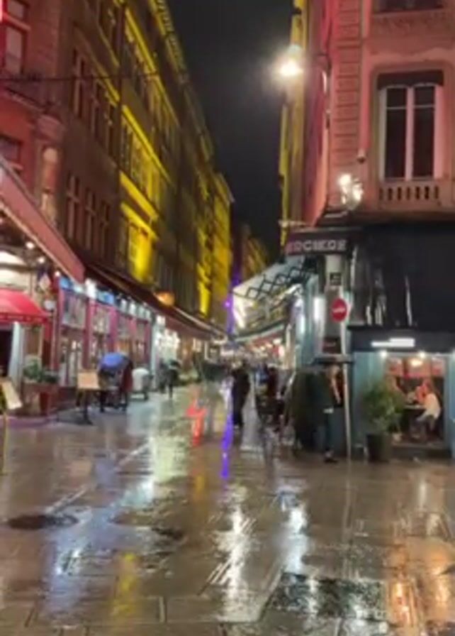 rain-slicked street in what appears to be a European city at night. The street is narrow and lined with tall buildings, mostly lit with warm yellow and pink light, with restaurants and shops on the ground floor. A few pedestrians are visible walking down the street, some carrying umbrellas. The ground is wet and reflects the lights, creating a shimmering effect. The scene evokes a calm and atmospheric mood.