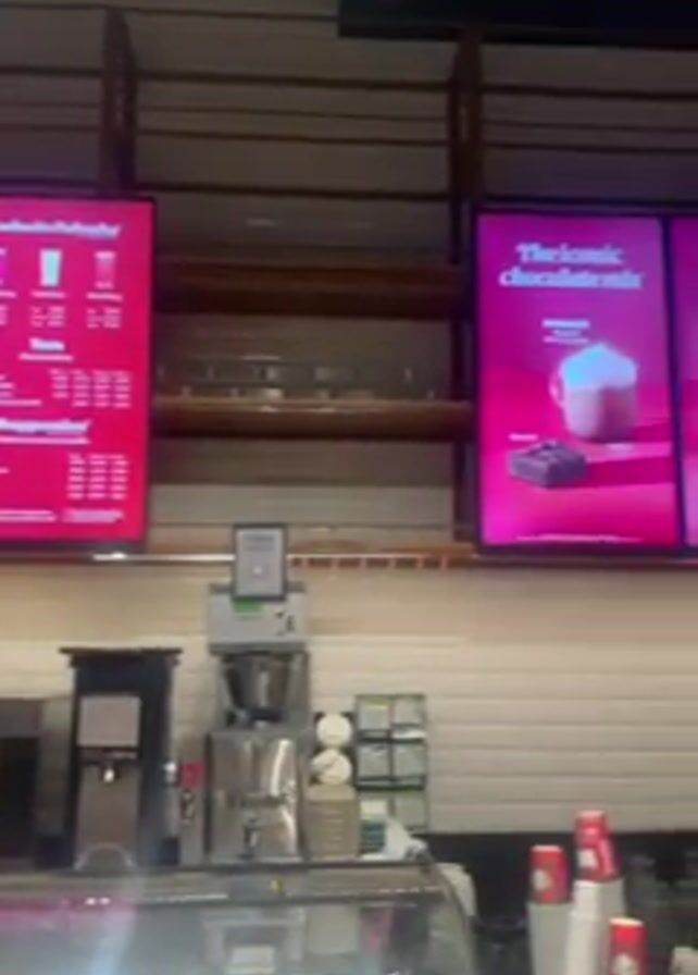 interior of a Starbucks coffee shop. Behind the service counter, there are digital menu boards displaying drink options and prices. Below the menus, there are coffee machines and other equipment. The counter has a display case with pastries. There are no people visible in the video. A security camera is mounted on the ceiling.