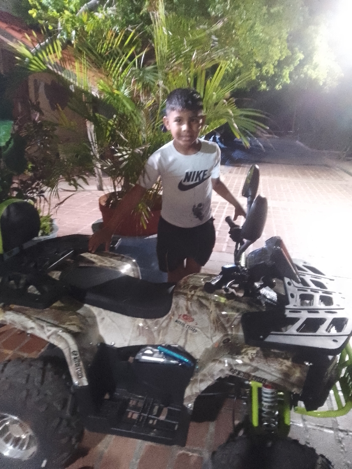 The scene is an outdoor paved area, likely a private patio or driveway, within the city of Unknown, Unknown. A young male, approximately 8-12 years old, stands beside a camouflage-patterned All-Terrain Vehicle (ATV). The boy, facing the camera with a slight smile, wears a white short-sleeved t-shirt with a black 'NIKE' logo and dark shorts. A dark smudge or handprint is visible below the shirt's logo. His left hand is on the ATV's fuel tank, and his right hand is near the handlebars. The ATV features a camouflage design (greens, browns, whites), a black seat, and a white grid-patterned front cargo rack. Visible yellow-green springs are part of the front suspension. It has large, knobby tires with chrome rims. A 'GP MOTOS CYCLES' decal is present on the side, and a blue cylindrical object is visible in the left footwell. The ground is paved with reddish-brown rectangular bricks. Dense green foliage, including potted palm-like plants, forms the background. Artificial lighting illuminates the area, indicating evening or nighttime conditions.