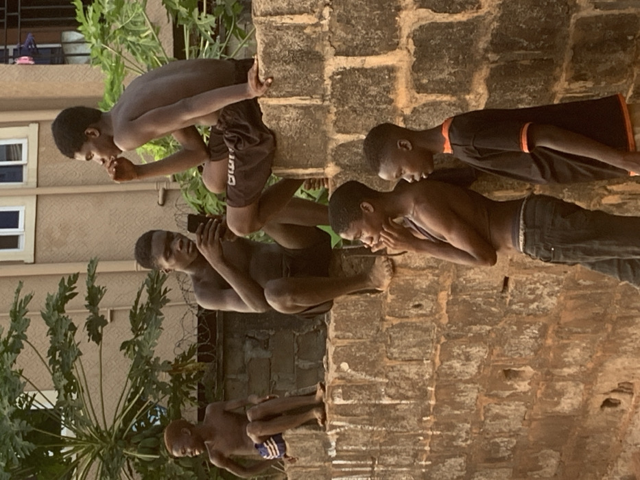 Four young men are depicted outdoors next to a brick wall