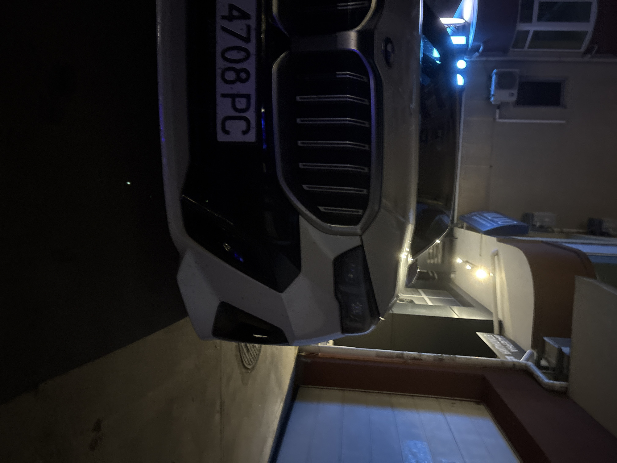 The image depicts an urban scene at night, specifically located on Tsar Petar Street 12, Burgas, Bulgaria. The primary subject is the front portion of a white BMW vehicle, parked on a paved surface. The car features a prominent dark vertical slat grille and partially visible headlights. A Bulgarian license plate, "4708 PC," is affixed below the grille, confirming the Burgas region. Blue interior lights are visible, casting reflections onto the windshield. To the immediate right of the vehicle is a building with a reddish-brown lower facade and a light-colored roll-up garage door. An awning extends above this entrance, from which a downspout descends. A vertical sign, partially illuminated, hangs perpendicularly from the building, displaying Cyrillic text including "КАФЕТЕРИЯ" (Cafeteria) and "ЕЛЕГАНС КО". Above the garage door, additional artificial lights are visible. To the left of the vehicle, a multi-story building with windows and an external air conditioning unit is partially visible. Blue light emanates from a section of this building. The ground features a visible manhole cover near the front right of the vehicle. No individuals are present in the frame.