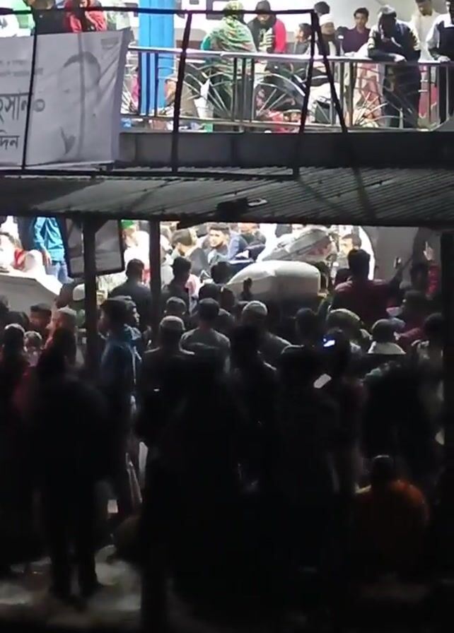 crowded scene at what appears to be a ferry terminal or similar transport hub at night. Many people are congregated under a covered area, waiting or disembarking. Some are carrying luggage. Above this crowd, on a higher level possibly part of a ferry or terminal building, more people can be seen. A large banner, partially visible, appears to be promoting "Md. Rajib Ahasan" and urging viewers to vote. The scene is dimly lit, creating dark silhouettes of the people below. The overall atmosphere seems busy and perhaps chaotic.