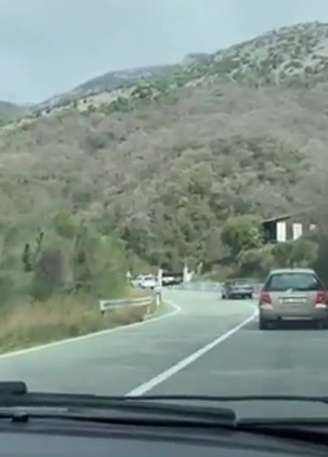 A car drives along a winding mountain road. The road has white lines and guardrails. There are several other cars on the road. The mountain is mostly bare, with some trees and shrubs. The sky is overcast. The video is shot from the perspective of the driver.