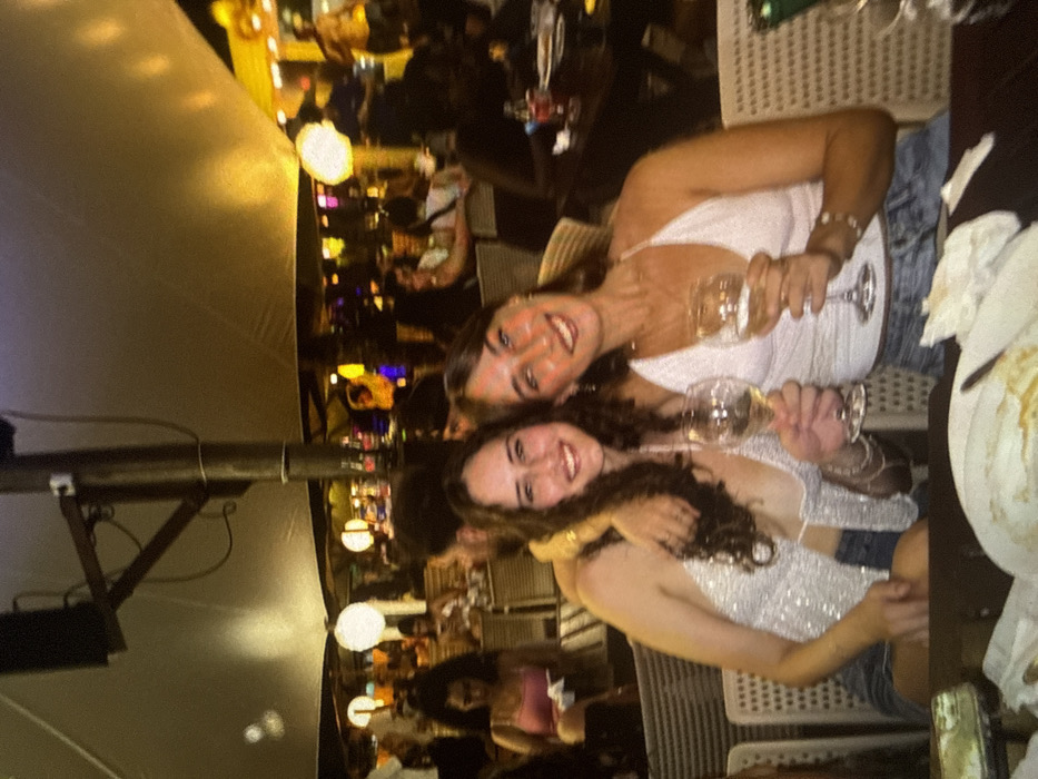 This image displays two young adult females posing for a photograph in a crowded outdoor or semi-outdoor restaurant or bar located in Cairu, Brazil, at night. The female on the left, possessing long, dark, curly hair, is wearing a light-colored, possibly sequined, halter-neck top and denim shorts. Her right arm is around the shoulder of the female on the right. She holds a wine glass containing a clear liquid in her left hand. The female on the right, with medium-length brown hair, wears a light-colored halter-neck top and light-wash denim shorts, holding a wine glass with a clear liquid in her right hand. Both individuals are smiling towards the camera. On the dark table in the immediate foreground, a plate with food residue and crumpled white napkins is visible. The background reveals numerous blurred patrons seated at various tables, indicating a busy environment. The area is illuminated by warm artificial lighting, including spherical white lamps and multi-colored lights. Overhead, a large, light-colored canopy or tent structure is visible, supported by a central pole. A male figure's back and shoulder are discernible between the two foreground subjects. Further into the background, a female in a pink top is seated, and a person in a yellow shirt is partially visible in the far right, possibly on an elevated platform.