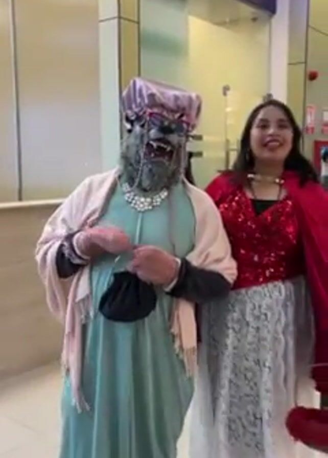 two people standing together in a hallway. On the left is a person dressed as the wolf from "Little Red Riding Hood" disguised as the grandmother. They are wearing a blue dress, pink shawl, and bonnet. Their hands are covered with brown mitts, and they are carrying a small black purse. They are waving with their left hand. To the right stands a person dressed as Little Red Riding Hood. She is wearing a red sequined top, a white lace skirt, and a red cape. She has a basket filled with flowers. People are walking in the background. The hallway seems to be inside a shopping mall with stores on either side.