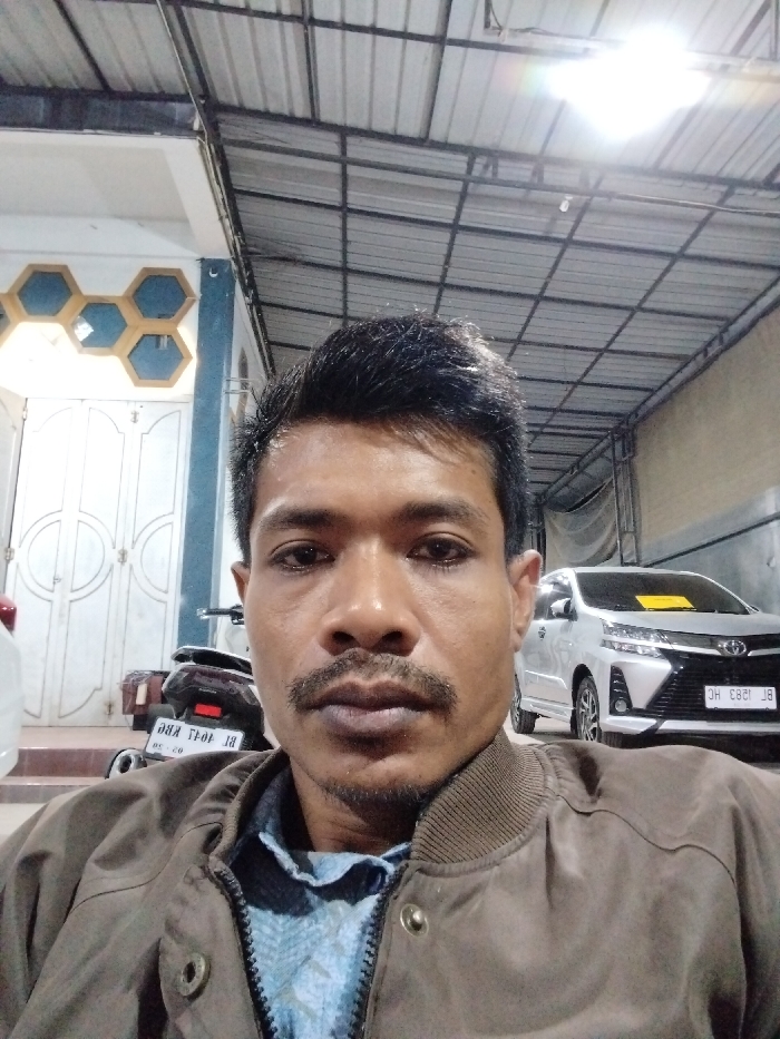 A frontal portrait-style image depicts an adult male positioned centrally, looking directly at the camera. The subject has dark, short hair and a moustache, and wears a dark brown bomber-style jacket unzipped over a blue patterned shirt. The scene is an outdoor covered area in Keudebayu, Indonesia, illuminated by artificial overhead lighting, visible as a bright flare in the upper right. The roof is constructed of corrugated metal supported by metal trusses. To the subject's immediate left, a white building with blue trim features double white paneled doors with a raised design, surmounted by hexagonal golden-brown decorative elements. A dark-colored scooter or motorcycle, bearing license plate "BL 7041 KBC (05.20)", is parked behind the subject on the left. To the subject's right, a silver Toyota Avanza/Veloz-type vehicle, with license plate "BL 1883 HC", is parked facing forward, displaying a yellow sheet on its windshield. A plain light-colored wall forms the background behind the vehicle on the right.