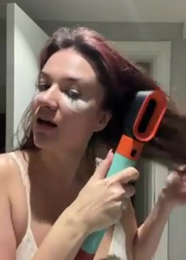 A woman with reddish-brown hair is in a bathroom, using a hair-styling tool with a teal handle and orange attachments to dry her hair