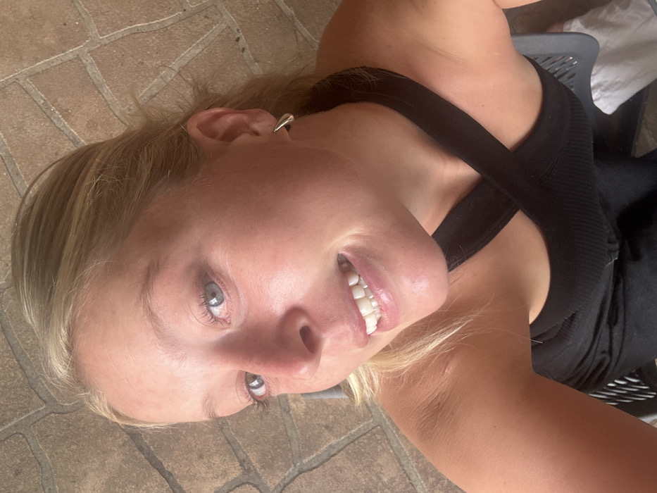 A fair-skinned woman with blonde hair and light blue eyes smiles broadly at the camera. She wears a black athletic tank top with crisscrossing straps. She has a silver earring. She is outside with a tiled floor beneath her. The photo is taken from a low angle, looking up at her. The lighting is bright and sunny.