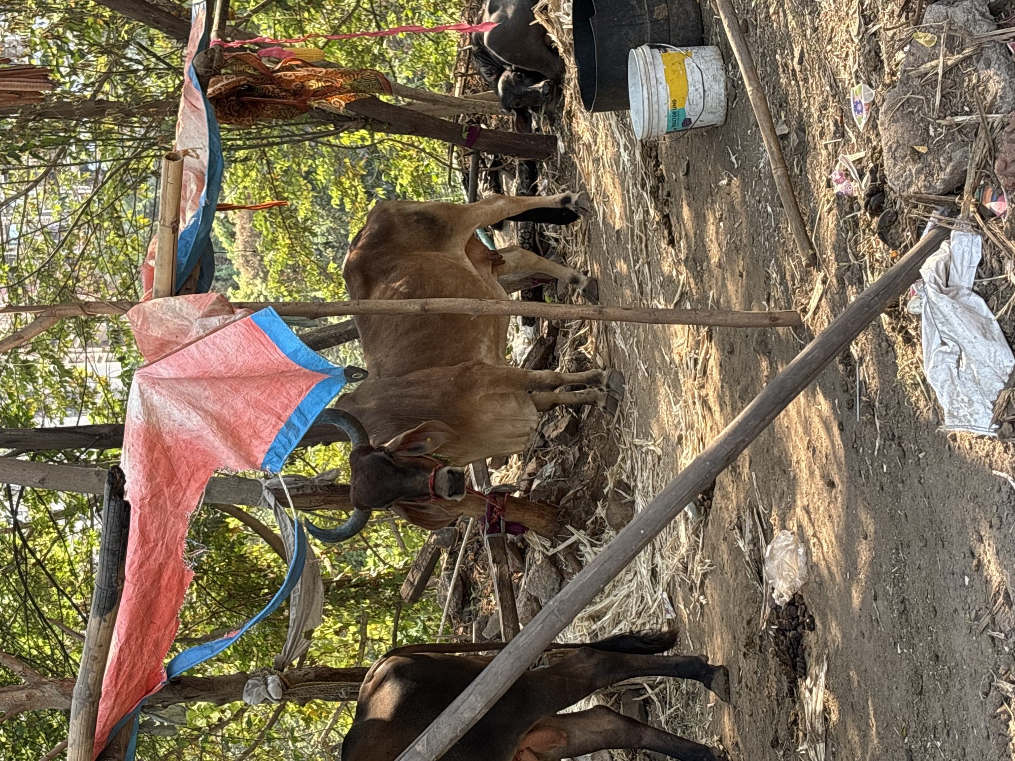 This image depicts a shaded outdoor animal enclosure in Ambernath, India. The scene features three bovine animals on a dry, dirt ground scattered with straw, rocks, and animal droppings. In the center, a light brown cow or bull stands facing the viewer. It possesses prominent, dark horns with blue tips and wears a red rope bridle around its snout. Its ears are visible, and its lower body shows evidence of udders. To the left, the hindquarters and udder of a darker brown cow are partially visible. In the background on the right, a dark-colored buffalo or similar bovine is lying down amidst hay, looking towards the viewer. The animals are beneath a makeshift canopy constructed from rough wooden poles and tree trunks. A red and blue plastic tarpaulin is stretched and tied over this frame, providing shade. Additional decorative fabric strips are draped on poles to the right. The ground is uneven, showing areas of bare earth, loose soil, and scattered debris including plastic bags, other refuse, and compacted animal droppings. In the lower right foreground, a white plastic bucket with a yellow label reading "TRACTOR UNO" sits next to a larger, dark-colored tub. The background shows dense green foliage from trees, with faint outlines of urban structures visible through the leaves, suggesting a transitional zone. The lighting indicates a sunny day with clear shadows.