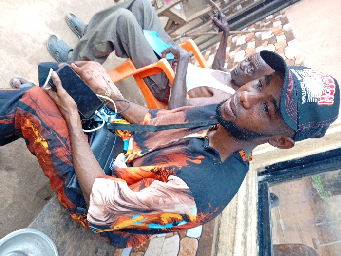 Two men pose for the camera. A younger man sits facing the viewer, wearing a colorful shirt and a black cap with text. He holds a black smartphone. An older man sits behind him in an orange plastic chair, wearing a white tank top. Both are outdoors with a window behind the younger man. The ground appears to be concrete.