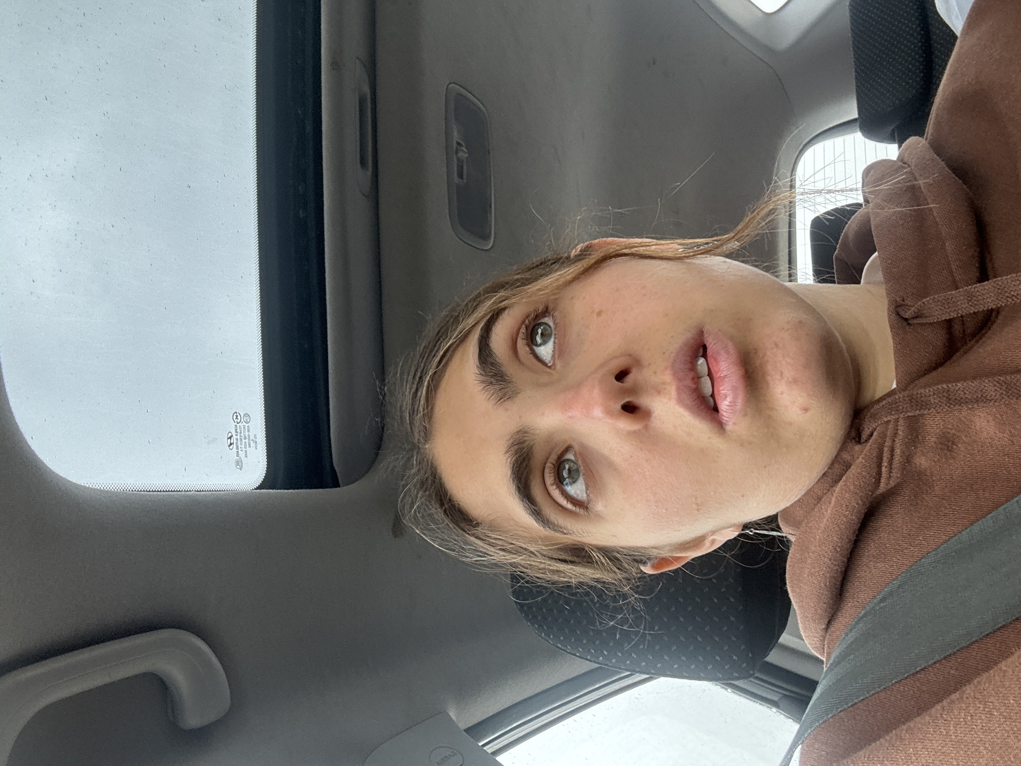 The image depicts a single individual, appearing to be a young adult female, seated in the front passenger seat of a Hyundai vehicle. She has light brown hair, light-colored eyes, and fair skin with some minor facial blemishes. She is wearing a brown hooded sweatshirt with visible drawstrings and a silver dangling earring on her left ear. A gray seatbelt is securely fastened across her left shoulder and chest. Her mouth is slightly open, and her gaze is directed upwards and to the right, indicating an upward focus. The vehicle's interior features a gray headliner, a black headrest, and a white grab handle on the passenger A-pillar, where "AIRBAG" text is also visible. An overhead light fixture is present in the ceiling. Above the individual, a sunroof is open, revealing an overcast sky with visible water droplets on the glass, consistent with precipitation. The sunroof glass prominently displays the Hyundai logo and manufacturing text including "HYUNDAI MOTOR GROUP" and "ASIAN GLASS". The rear of the vehicle shows an additional black headrest and a partially visible window. The scene occurs during daylight hours under an overcast sky with rain or moisture. The location of the vehicle is in Be'er Sheva, Israel.