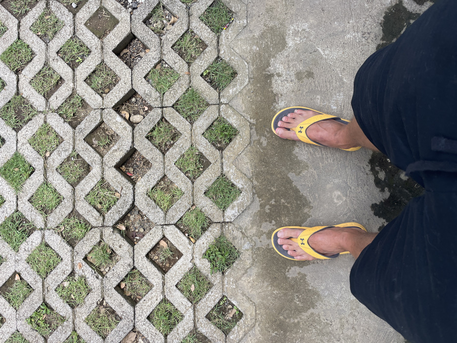 A top-down view captures the lower extremities of an individual standing on a ground surface in Denpasar, Indonesia