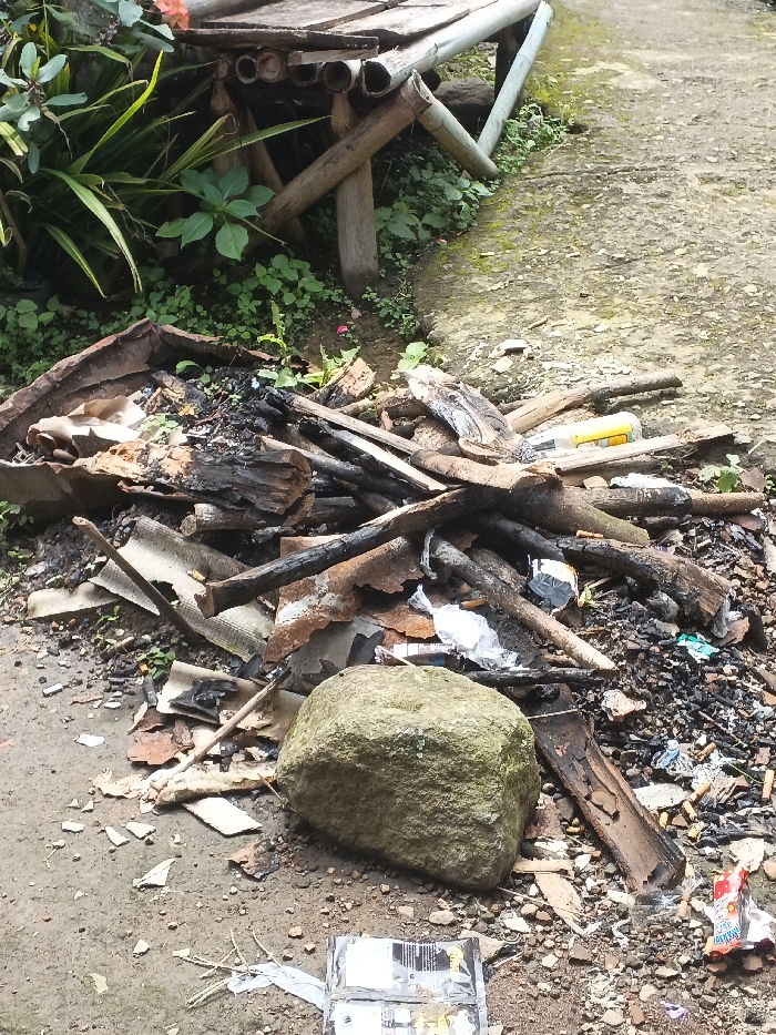 A chaotic pile of debris rests on the ground near a simple bamboo bench. The refuse includes burnt wood, charred fragments, and pieces of corrugated metal. A large, moss-covered rock sits among the mess. Litter, such as wrappers and a discarded carton, adds to the untidiness. Greenery and plants grow near the bench, contrasting with the surrounding disarray.
