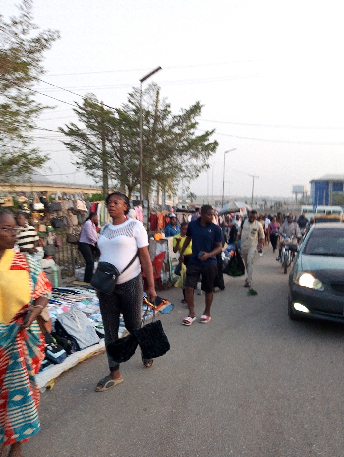 A bustling street scene with a mix of pedestrians and vehicles. A woman in a white top and patterned leggings walks towards the camera, carrying two black bags. To her left, a woman in a colorful patterned garment stands by a makeshift clothing stall. Further back, a man in a blue shirt and shorts walks in the same direction. A car with its headlights on drives towards the right. Other people, stalls, and overhead wires add to the busy environment.