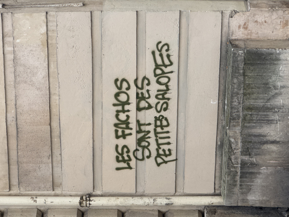 The image displays a close-up section of an urban building wall in Paris, France. The wall consists of light-colored, horizontally-banded concrete or stucco, exhibiting various shades of off-white and beige, with some areas showing minor discoloration and surface texture variations. A cream-colored vertical pipe or downspout runs along the left edge, featuring a rusted collar joint approximately one-third of the way down from the top. Below the main wall structure, a darker, heavily weathered concrete base is visible, characterized by vertical streaks of dirt and moisture. Centrally located on the lighter upper wall section, dark olive-green spray paint spells out three lines of French text: "LES FACHOS", "SONT DES", and "PETITES SALOPES". The spray paint exhibits visible drips, particularly beneath the letters, indicating its application method. No individuals, actions, or interactions are visible within the frame.