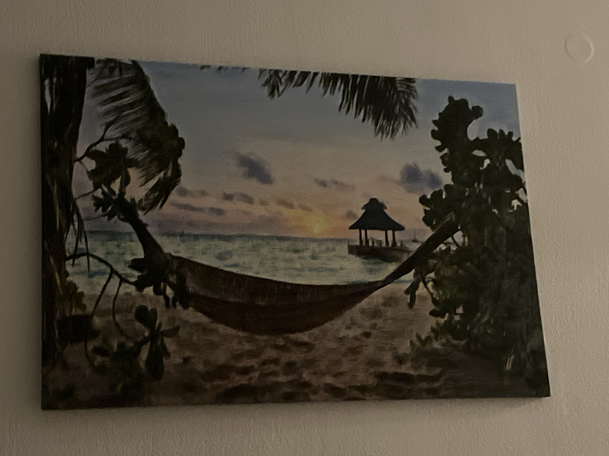 The image is a painting depicting a beach scene. A hammock is strung between two trees, with a view of the ocean in the background. A small structure, possibly a gazebo or hut, sits on stilts in the water. The sky is a mix of orange and blue, suggesting either a sunrise or sunset. The foreground is mostly sand and the lower parts of the trees. The painting is mounted on a light-colored wall. The scene does not appear to be in Ofrynio Beach, Greece. It resembles a tropical or subtropical beach.