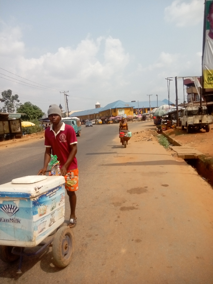 This image captures a daytime street scene in Enugwu-Ukwu, Nigeria