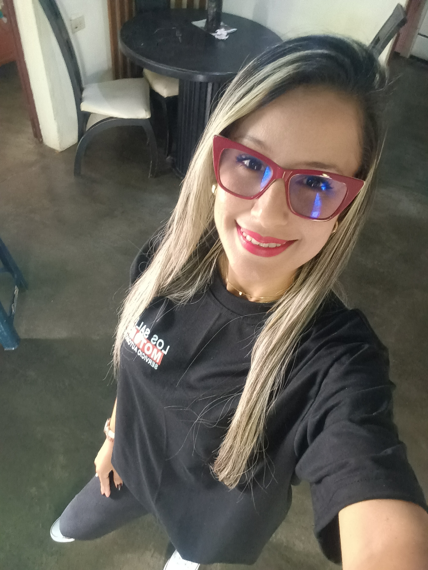 A woman is standing inside. She is wearing black leggings and white sneakers. She has a black t-shirt with a white logo on it. She has long blonde hair and is wearing red glasses. A round, black table and two white chairs are behind her. The location is most likely in a building in the city of Las Tejerías, Venezuela.
