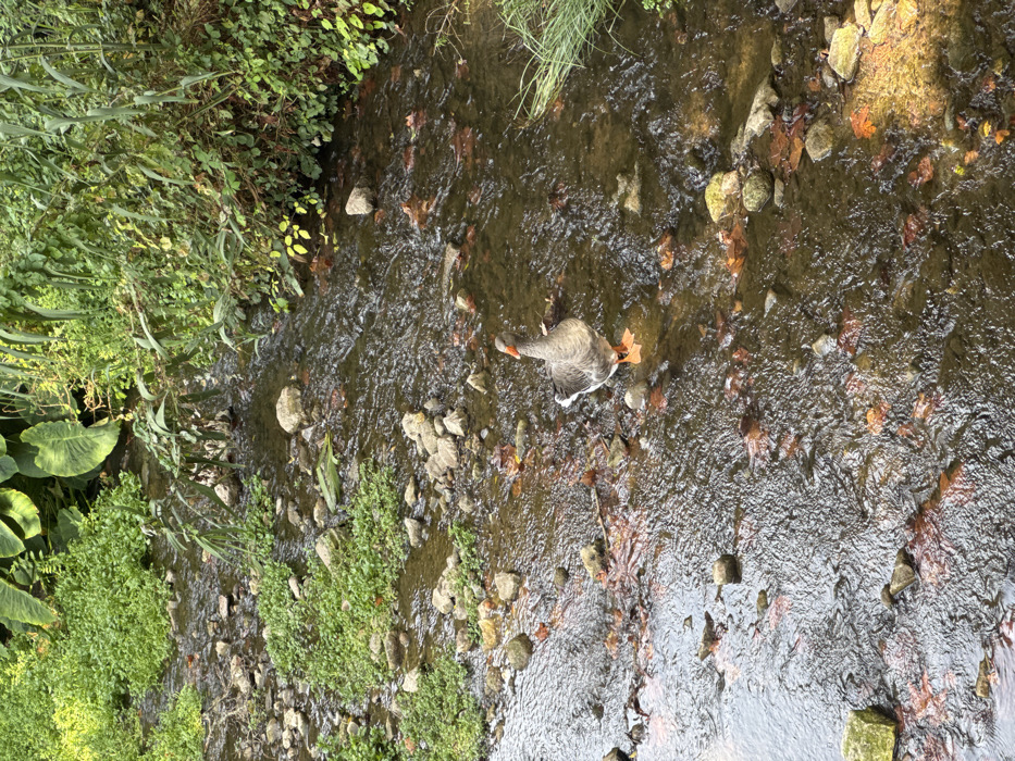 - "A single grey and white goose with an orange beak and orange webbed feet stands in a shallow, rocky stream in Colares, Portugal" by FM-6wyrF3, licensed under CC BY 4.0
