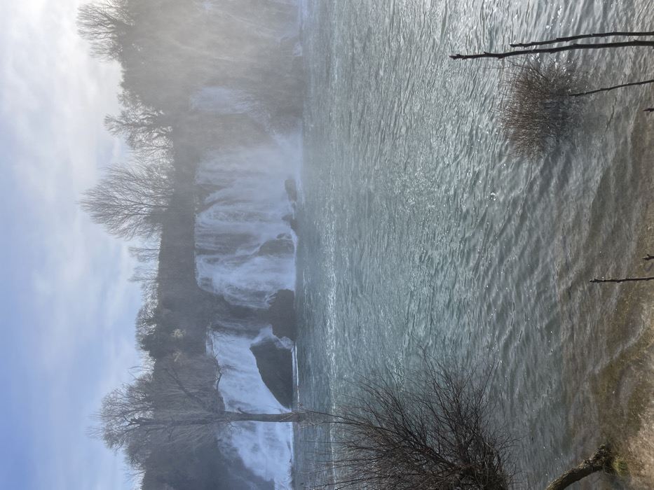The image depicts Kravica Waterfall in Zvirići, Bosnia and Herzegovina, viewed from the river level. A wide, multi-tiered waterfall cascades into a turquoise-colored river that dominates the mid-ground and foreground. Prominent water mist and spray rise from the powerful falls, particularly on the right side, partially obscuring the distant trees. The background features a dense line of bare deciduous trees along the top of the waterfall and its surrounding banks, indicating a cold season. A tall, bare tree stands distinctly on the left bank, partially submerged in the water near the falls. The sky above is light blue with sparse cloud cover, suggesting a bright day, possibly with low sun causing some atmospheric haze or glare on the right. In the foreground, the river water shows ripples and reflects light. The shallow left bank reveals submerged sandy or muddy ground. Smaller, bare shrubs and individual branches protrude from the water and riverbank in the immediate foreground, anchoring the scene. No individuals or man-made structures are present within the frame.