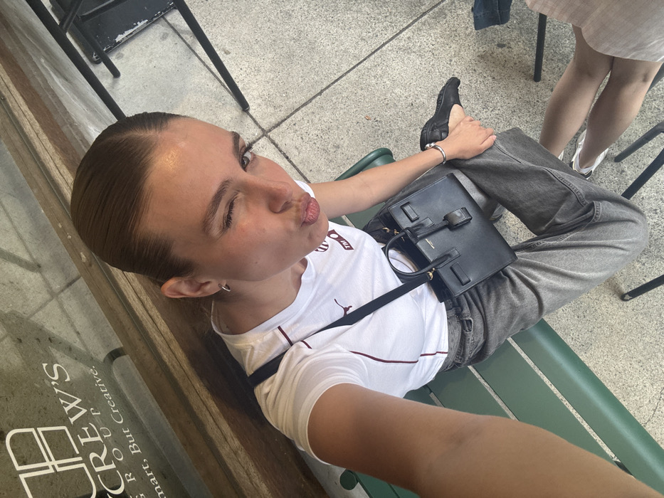 - "A female individual is depicted in a high-angle selfie, seated on a green slatted bench outdoors in Shibuya, Tokyo, Japan" by FM-GMxhS2, licensed under CC BY 4.0