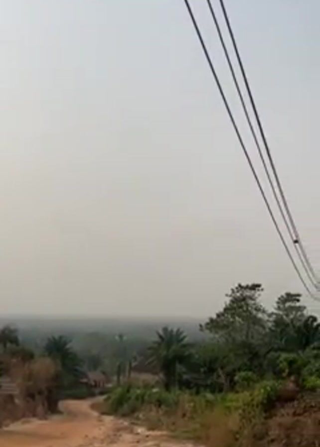 The camera, positioned at a high vantage point, looks down upon a landscape. A dirt path descends from the camera's location, and three electrical lines run along the top of the frame. The landscape below is a mix of dense green trees and vegetation. Scattered among the trees are buildings with white and red roofs. The sky is overcast, creating a flat, hazy light that obscures details in the distance. The overall impression is of a rural or semi-rural area with buildings interspersed within lush greenery.