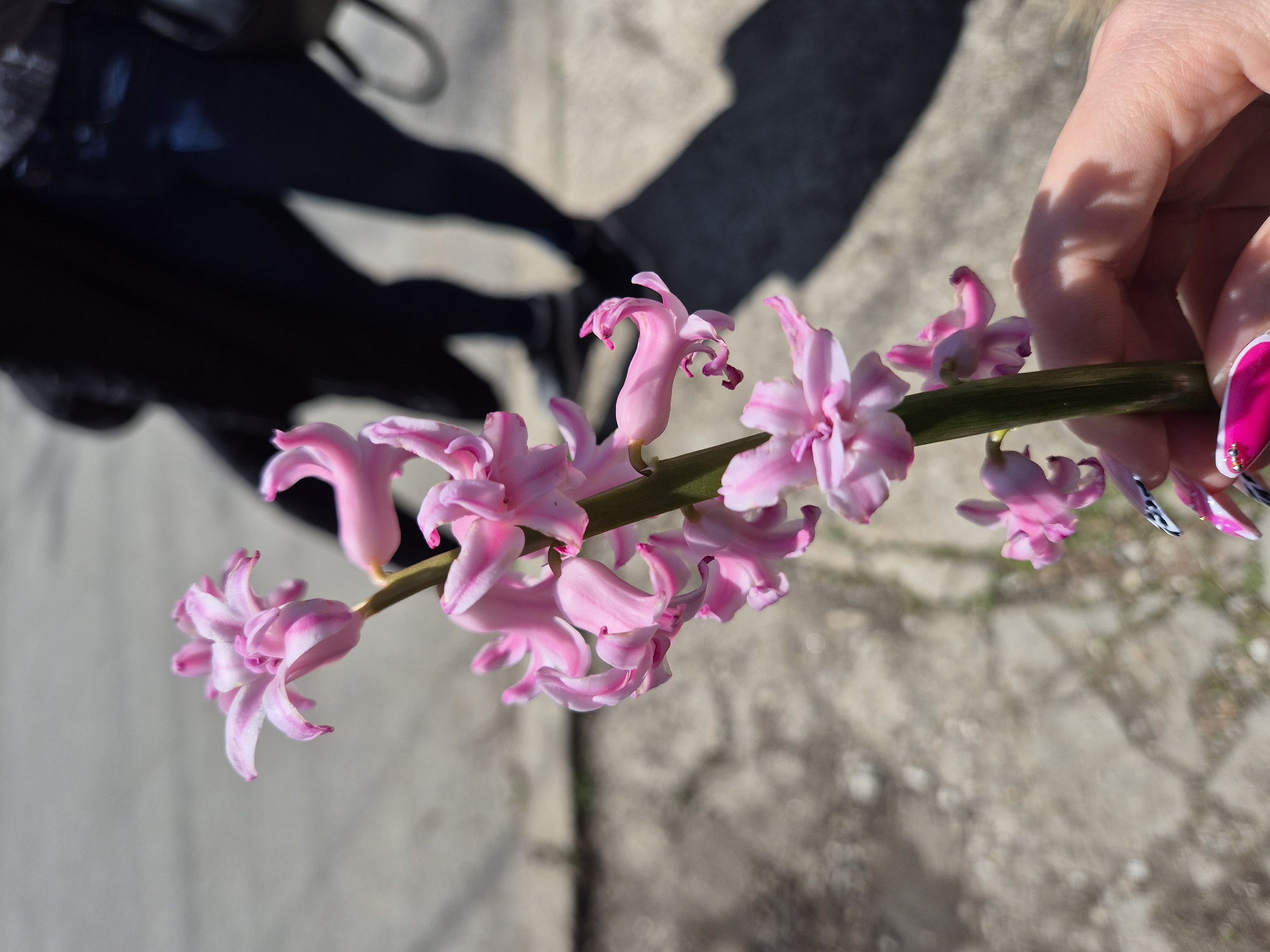 stem of pink hyacinth flowers held in a hand with elaborately decorated nails. The background is a paved area, possibly a sidewalk or courtyard, with a blurry shadow of a person wearing dark clothing in the upper left. The scene is outdoors, with bright sunlight casting the shadow. Given the request for location details, it's likely the photograph was taken in the city of Pavlikeni, Bulgaria, but without further information, the precise location within the city is impossible to determine.