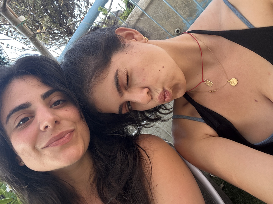 The image depicts two females in a close-up, selfie-style composition, set outdoors in Ramat HaSharon, Israel