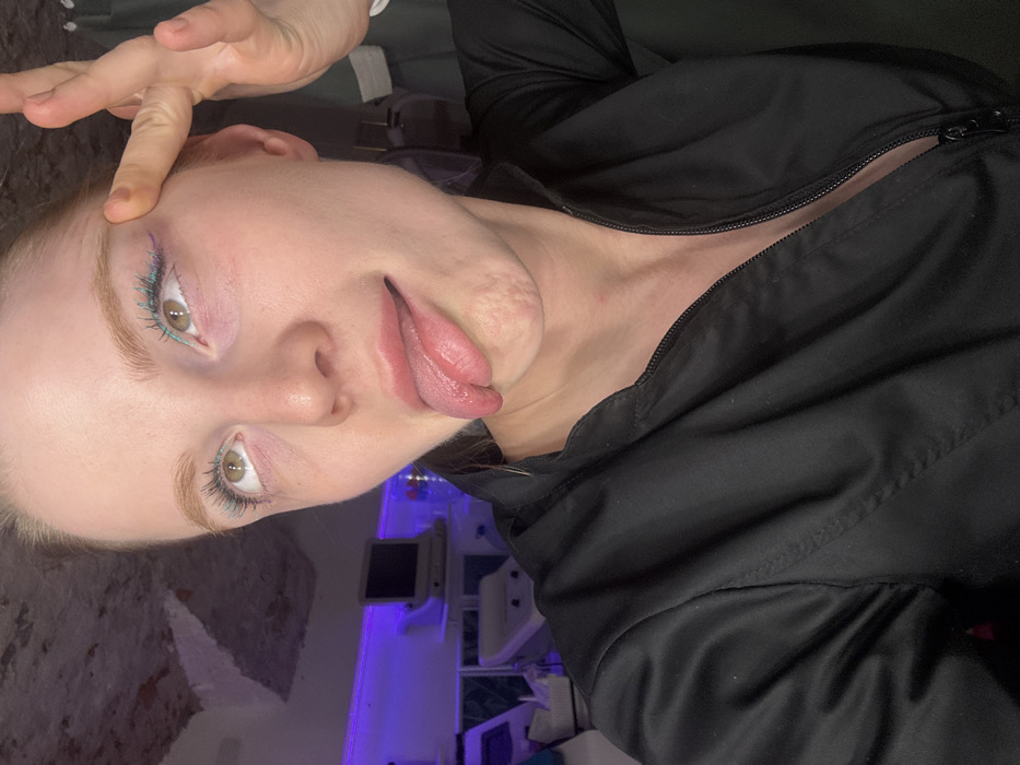 The scene is located in a room within the city of Saint Petersburg, Russia. A fair-skinned individual, appearing female, is captured in a medium-close-up selfie. The individual has light-colored hair pulled back and is wearing a black long-sleeved top with a partially unzipped front. Her light brown eyes are rolled upwards, accentuated by teal mascara on both upper and lower lashes, and a subtle purple eyeliner above the upper lashes. Her tongue is fully extended from her mouth, displaying a prominent central groove or split. The individual's right hand is positioned at her right temple, with fingers splayed as if gently pulling the skin upwards. The background reveals an indoor setting with prominent purple LED strip lighting along the top of a white wall. Visible objects include an older model monitor or medical device on a white shelf, a clear bottle containing blue liquid, and a portion of a white treatment chair or bed. The upper left of the image shows a white ceiling with exposed brickwork or rough plaster. A dark curtain or wall is present on the far right.